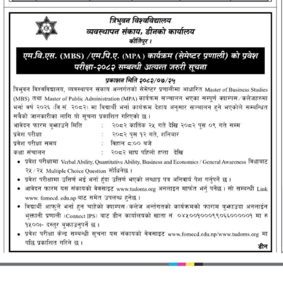 एम.वि.एस. (MBS) /एम.पि.ए. (MPA) कार्यक्रम (सेमेस्टर प्रणाली) को प्रवेश परीक्षा–२०८२ सम्बन्धी अत्यन्त जरुरी सूचना